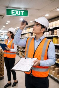 Selain APAR, auditor juga akan menilai signage dan informasi keselamatan. Pada kondisi darurat, petunjuk visual berperan penting yang menjadi penentu keselamatan, terutama ketika terjadi kepanikan. Papan EXIT, tanda jalur evakuasi, petunjuk lokasi APAR, dan instruksi singkat tindakan saat kebakaran harus dapat terbaca dengan jelas dari berbagai sudut. Saat pemeriksaan gedung, sering terjadi temuan signage yang tertutup, pudar, maupun tidak sesuai standar.